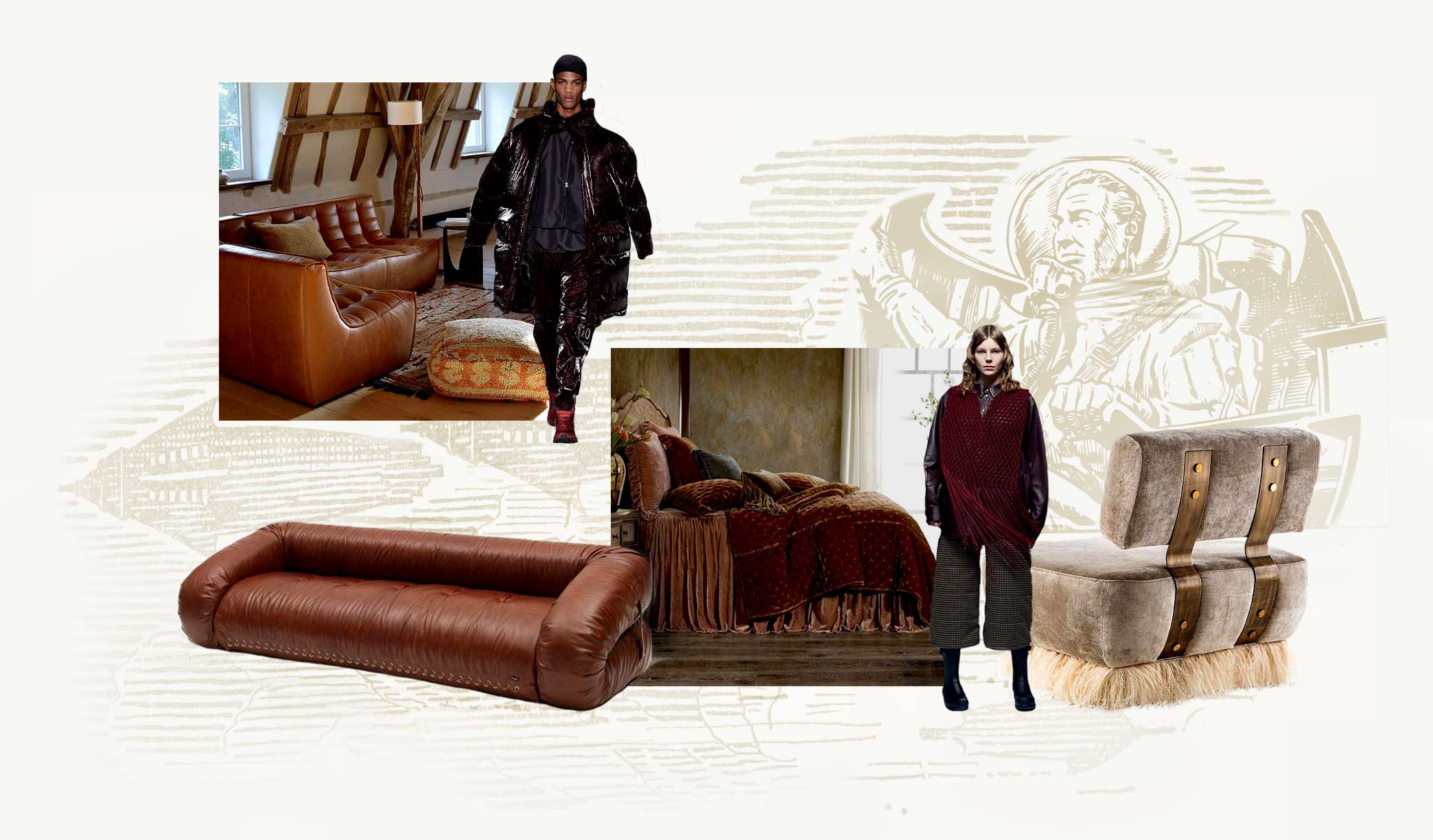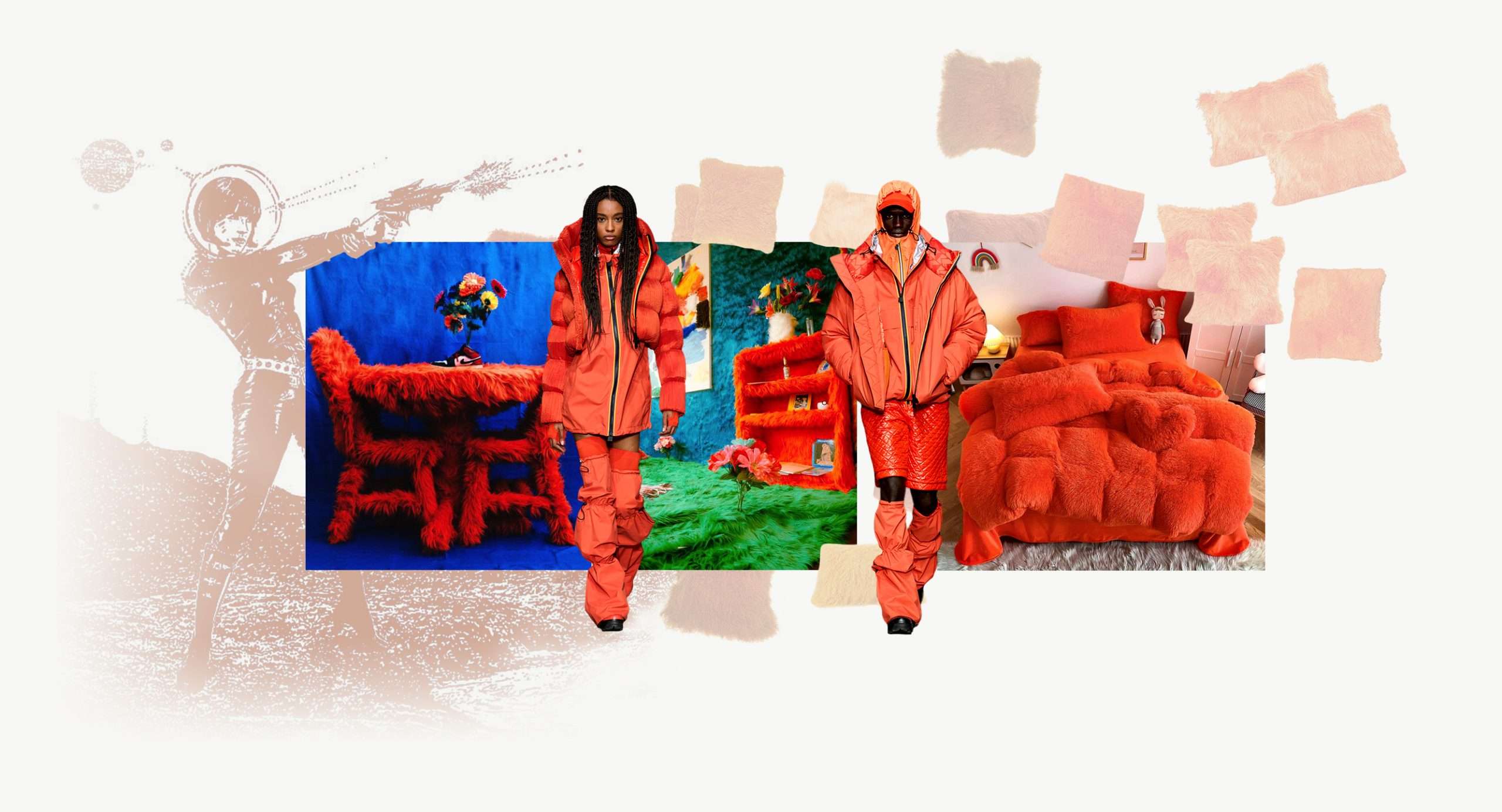 Unique forms and shapes create movement, allowing even the simplest colors and minimal designs to be exciting. For example, the rounded shape and curved lines of the puffer coat and tied pants below add dynamism. Likewise, the seating and lighting in the same image demonstrate an intense beauty, instantly catching the eye before leading it around the room in an interior tour.