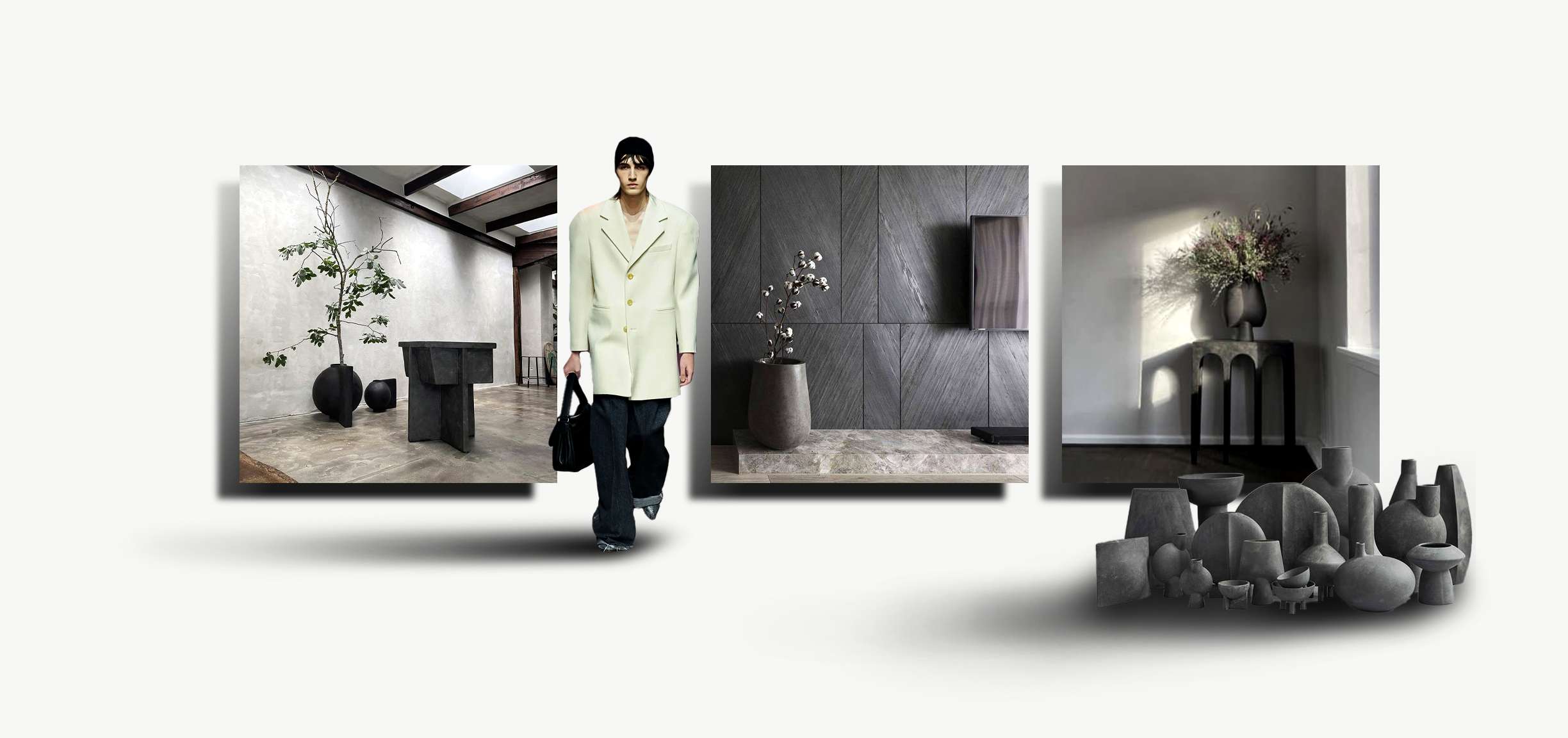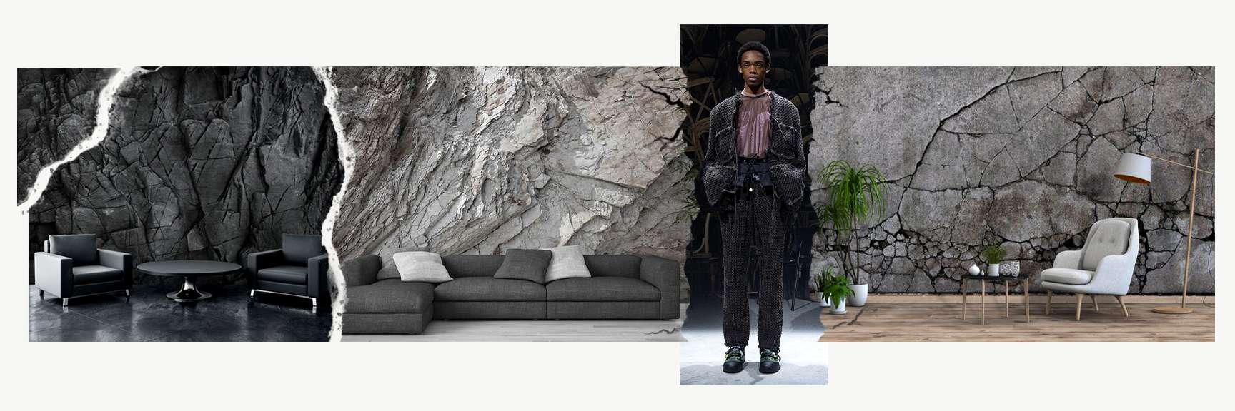 However, texture can mitigate an overwhelming darkness. For example, the woven fabric and fringe in the fashion ensemble below add both interest and relief for the onlooker. Similarly, the interiors utilize the natural and raw texture of the stone walls to commit to the drama without becoming a devastating black hole.